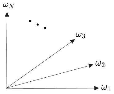 For a finite sample space of size , the r.v.s are elements of , so there is clearly a basis consisting of the indicators on each point of ; this is just the standard basis, but we’ll label them by their underlying point in . We can schematically depict the vector space: