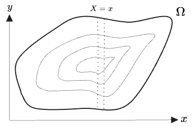 Note that and describe a random variable and distribution over the highlighted slice of only—this is a different space from the original . (And on its own is not really a thing, but could be perhaps defined as a function of which gives a random variable for each .)