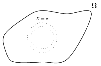I’ve depicted as a blobby shape, with contour lines suggesting a distribution on the space. A sample space need not have any “intrinsic” shape like this, as it’s just a set. But given two non-equal random variables , we can always increasing values of as an coordinate and then take as a y-coordinate to arrange the elements into some kind of blobby shape.