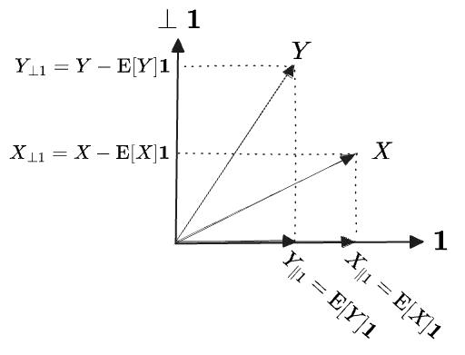To get the covariance we have to compare, not the r.v.s themselves, but their rejections off the subspace of constant functions. The “constant functions” are all multiples of the unit constant function , which corresponds to the vector . (It’s a unit vector because its norm is 1, since our measure is a probability measure and integrates to , .) Then the expectation/mean is just the inner product with this unit vector: