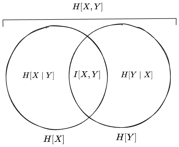 But, note, that while this diagram suggests an interpretation of entropy as the “measure” or “size” of some set—since Venn diagrams depict schematically the relationships between sets subsets—there exists no set of which these various entropy expressoins are measures. Instead we made the “Venn diagram” work by defining the mutual information