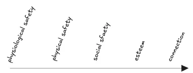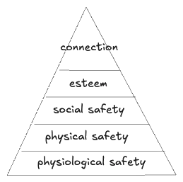 “Social safety” here means a freedom from abuse and ostracization, while “esteem” refers to social status, which may be seen as a safety from the exclusion from entitlements, attention, and respect. “Connection” here is quite a bit like Maslow’s original “self-actualization”, which I think of as including things like romantic relationships, artistic expression, and acceptance into a role in a community—broadly it entails “becoming a part of a larger whole”,1 and can perhaps be thought of as a “safety from disconnection”.