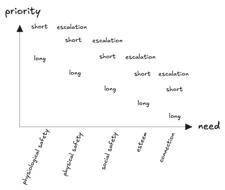 Now, how do short-term needs stack against long-term needs? What will a person trade away to avoid starvation in the future, say? Not their immediate physical safety—they’ll hold out for some unknown providence. But they likely will suffer mistreatment: if you don’t know how you’re going to feed yourself through the winter you will likely take any job, regardless of how unpleasant. What will a person do to avoid the risk of physical harm in the future? In generaly they won’t suffer abuse in the present—because abuse today may well become harm in the future; here I think of standing up to a bully—but they generally will tolerate a lowered social status. Roughly it appears the “long-term” timescale of each need is about on par with the “short-term” need two levels down, giving a need vs. priority relationship like the following: