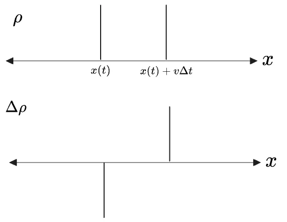 The delta-function case is easy, because the entire density is located at a single coordinate at all times. Let us see what it looks like first with a discretized time coordinate, where in an interval
